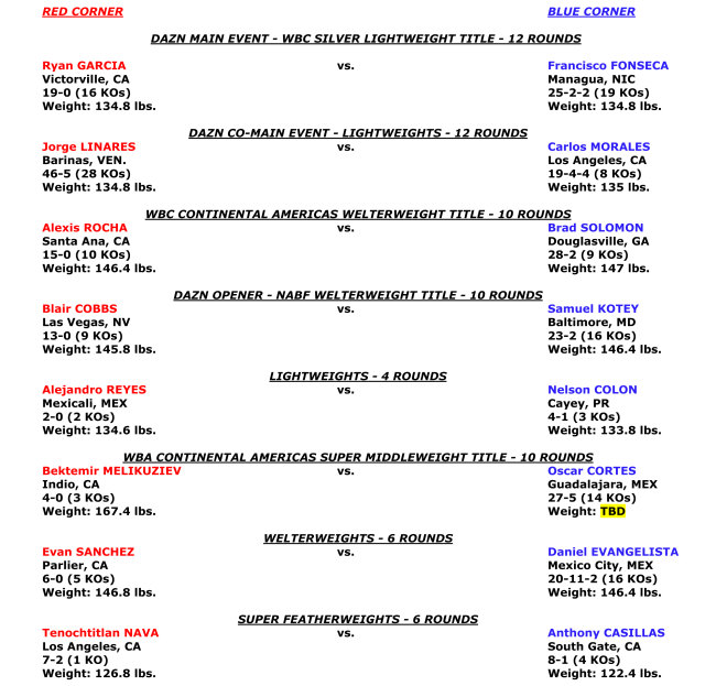 García vs. Fonseca es una pelea de 12 asaltos por el título de peso ligero de plata del CMB presentado por Golden Boy. El evento está patrocinado por Hennessy “Never Stop. Never Settle”. El evento tendrá lugar el viernes 14 de febrero en el Honda Center en Anaheim, California, y se transmitirá en vivo exclusivamente en DAZN.